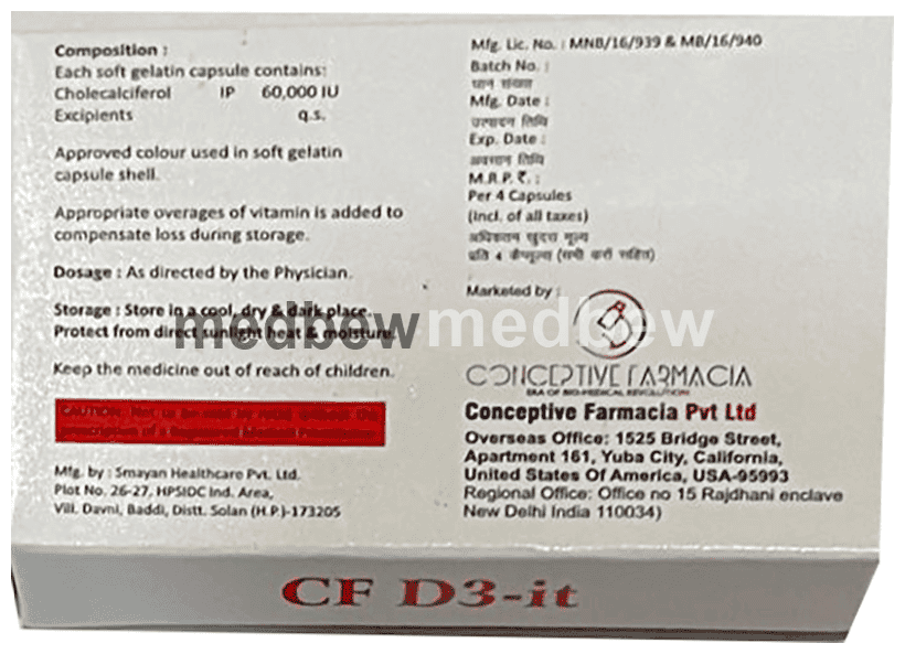 If you miss a dose of CF D3-IT Softgel Capsule, take it as soon as possible. However, if it is almost time for your next dose, skip the missed dose and go back to your regular schedule. Do not double the dose.