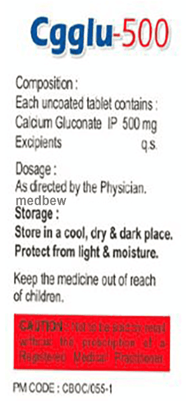 Cgglu 500 Tablet is a medicine used as a dietary supplement of calcium. It helps in treating calcium deficiency in the body. It also helps keep the bones strong and prevent certain muscle disorders.