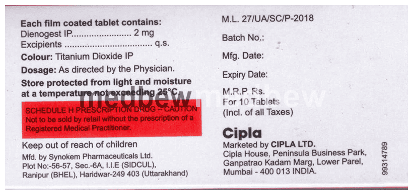 Cipgest 2mg Tablet contains a medicine Dienogest, which is a type of progesterone (a female sex hormone). It is used in the treatment of endometriosis, a painful disorder in which the tissue that normally lines the inside of your uterus grows outside your uterus.