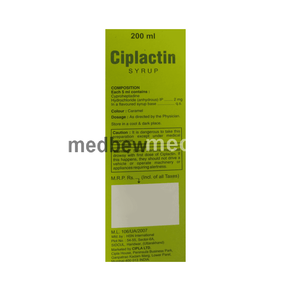 Ciplactin Syrup belongs to a group of medicines called antihistamines. It is used in the treatment of various allergic conditions. It relieves symptoms of inflammation as well as itching, swelling and rashes. It is also used to treat loss of appetite (need for food). It is an effective hunger stimulant.