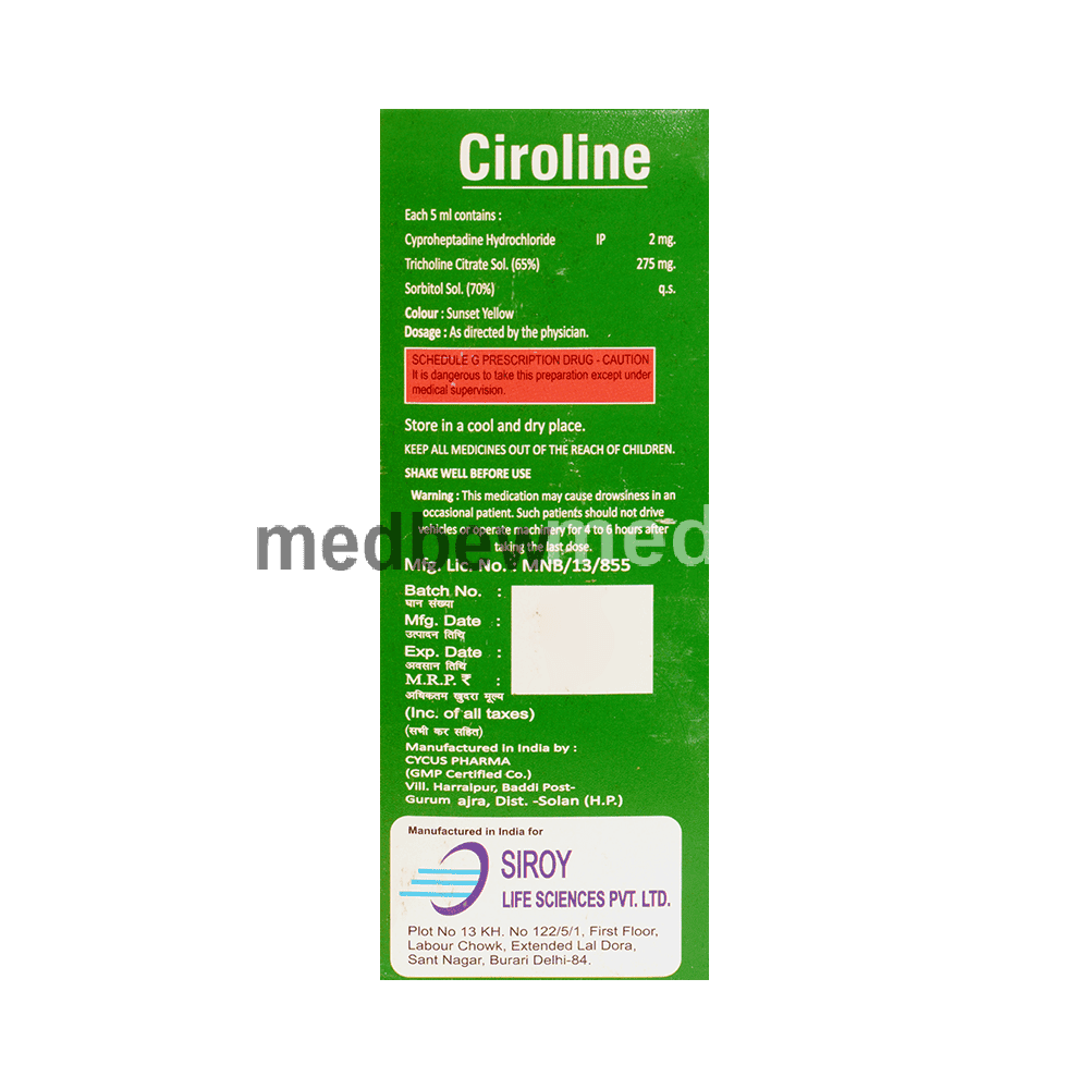Ciroline Syrup is a combination medicine used to treat loss of appetite. It is an effective appetite stimulant. It works by reducing the effect of a chemical messenger which regulates appetite.