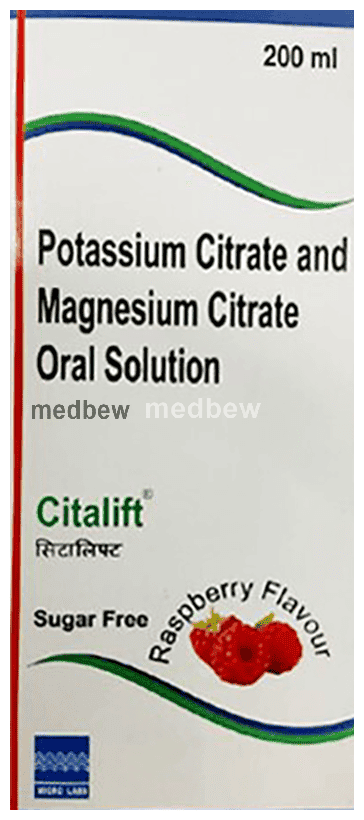 Citalift Oral Solution Raspberry Sugar Free is a combination of two medicines: Magnesium Citrate and Potassium Citrate which prevent kidney stones. It raises urine pH and prevents the formation, growth and aggregation of crystals in the kidneys, thereby preventing stones.