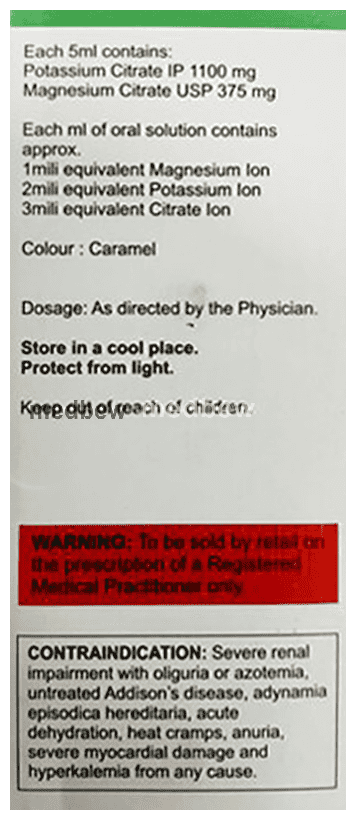 Composition Magnesium Citrate (375mg/5ml) + Potassium Citrate (1100mg/5ml)