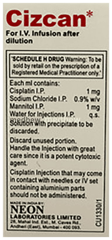 Cizcan 10mg Injection is used in the treatment of ovarian, cervical and testicular cancer. It shows its working by stopping or slowing down the growth of cancer cells.