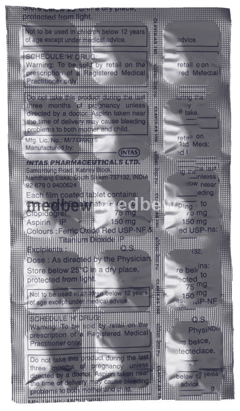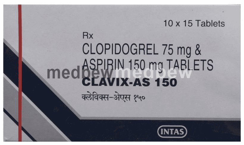 Clavix-AS 150 Tablet is a combination of two antiplatelet medicines: Aspirin and Clopidogrel which prevent heart attack. They work by preventing the platelets from sticking together and decrease the formation of harmful blood clots.