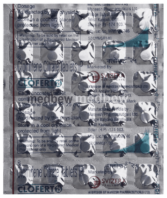 Clofert 25 Tablet is a selective estrogen receptor modulator (SERM) which treats female infertility. It works by promoting the release of reproductive hormones. This helps stimulate the release of eggs from the ovary (ovulation).