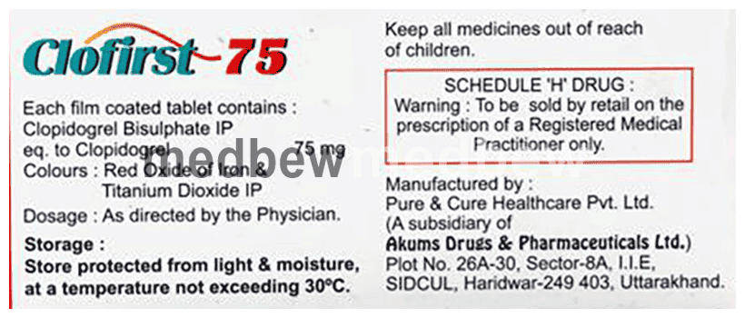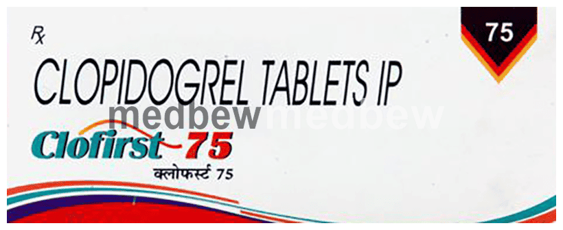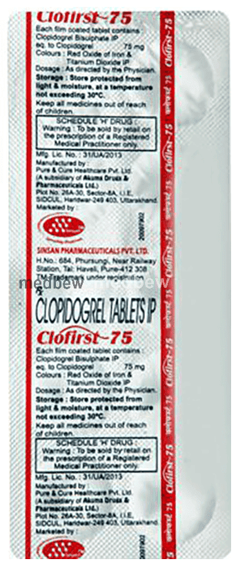 Clofirst 75mg Tablet is an antiplatelet medicine, or blood thinner. It works by preventing cells called platelets from sticking together and helps to prevent your blood from clotting inside veins and arteries. This helps the blood flow freely around your body thereby preventing a heart attack or stroke (or deep vein thrombosis or pulmonary embolism). Take this medicine regularly and make appropriate lifestyle changes to achieve maximum benefits. It is often prescribed along with a low dose of aspirin which also helps to prevent blood from clotting.