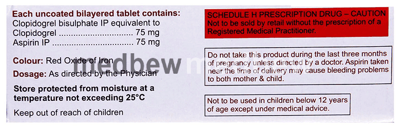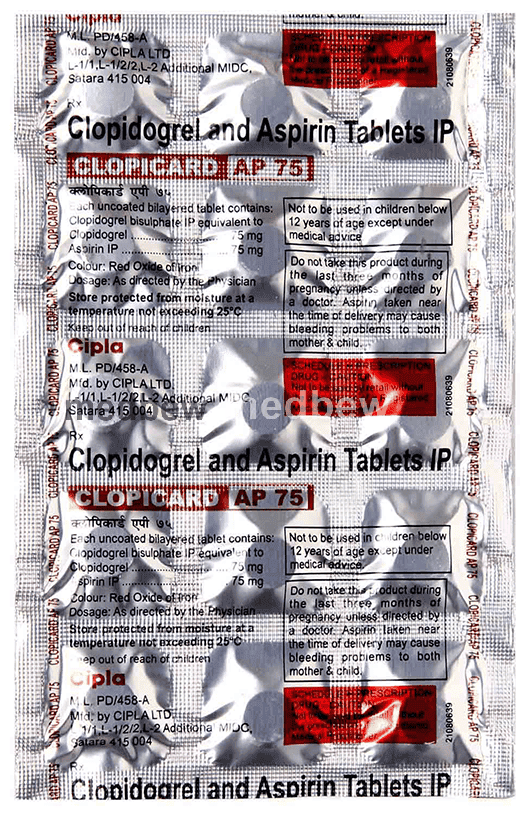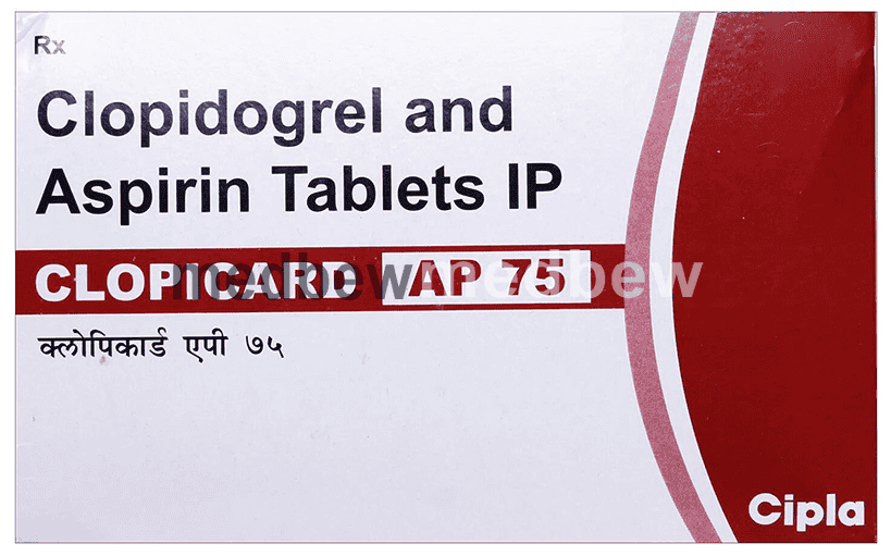 Clopicard AP 75 Tablet is a combination of two antiplatelet medicines: Aspirin and Clopidogrel which prevent heart attack. They work by preventing the platelets from sticking together and decrease the formation of harmful blood clots.
