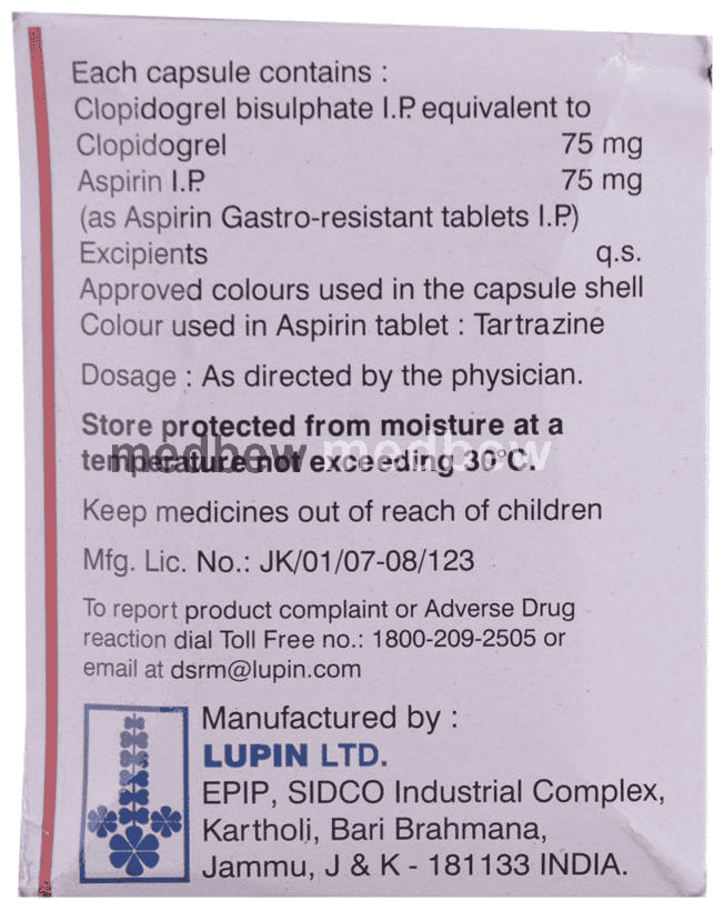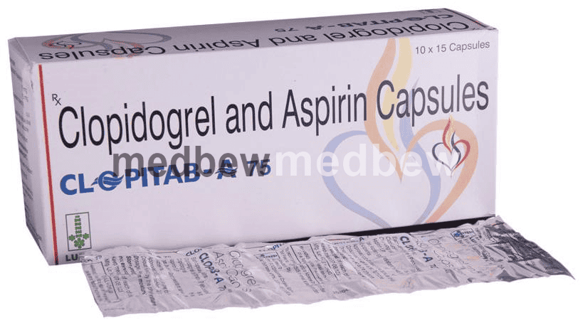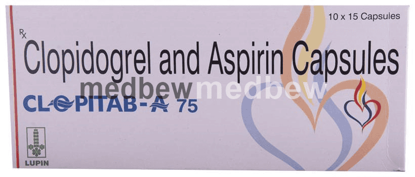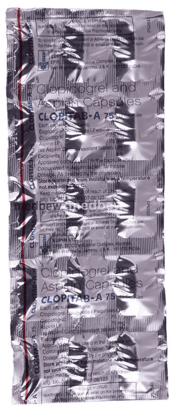 Clopitab-A 75 Capsule is a combination of two antiplatelet medicines: Aspirin and Clopidogrel which prevent heart attack. They work by preventing the platelets from sticking together and decrease the formation of harmful blood clots.
