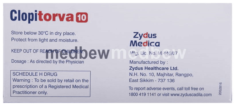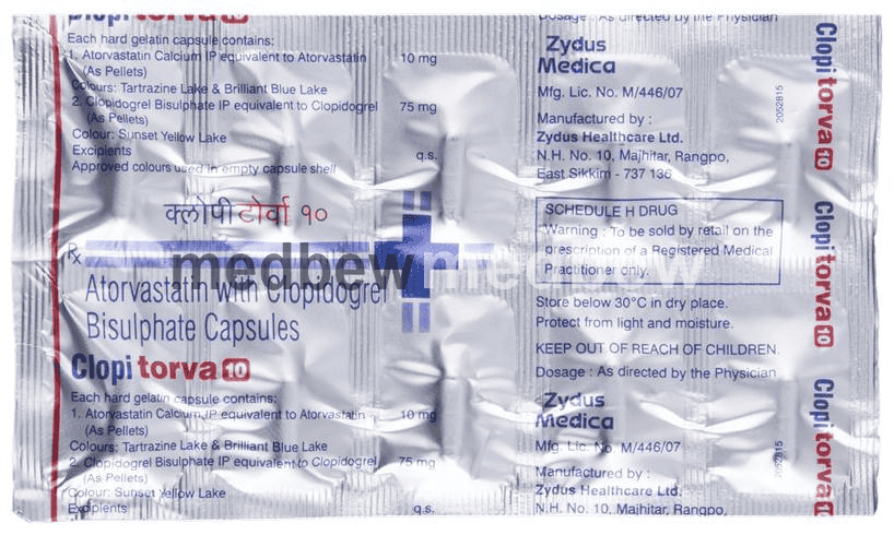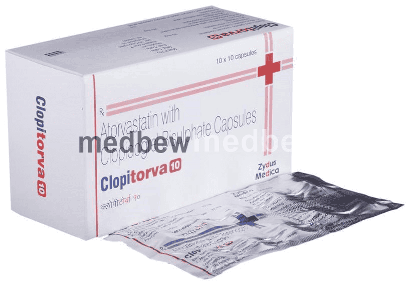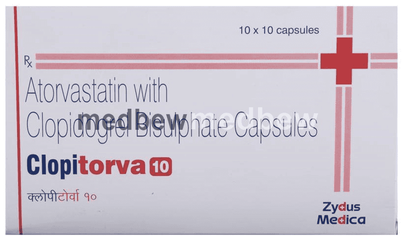 Clopitorva 10 Capsule is a combination of two medicines used to prevent heart attack and stroke. This medicine reduces the “bad” cholesterol (LDL) and triglycerides (fats) levels. Moreover, it also decreases the formation of blood clots.