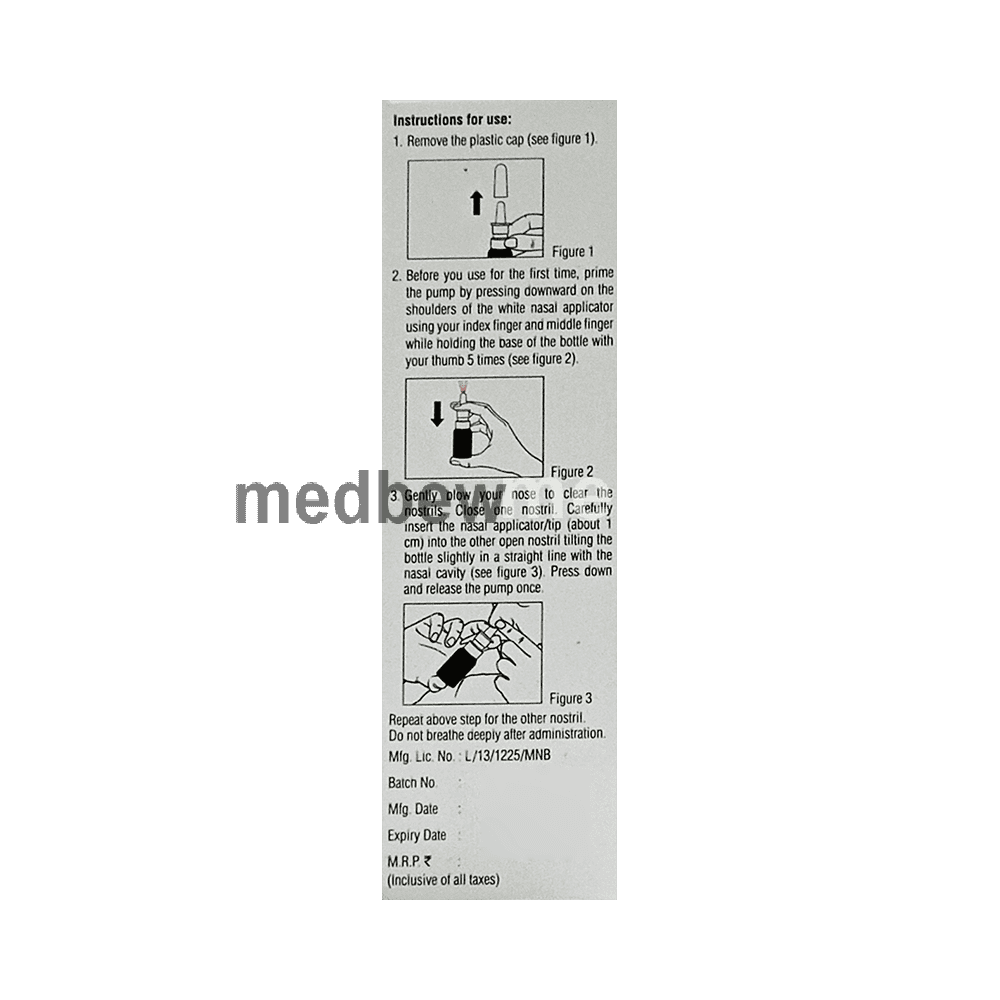 Use this medicine in the dose and duration as advised by your doctor. Check the label for directions before use. Insert the bottle tip into one nostril and close the other nostril. Direct the spray towards the sides of your nostril, away from the cartilage dividing the two sides of your nose. As you spray, breath gently and keep the head upright. Repeat the same process for the other nostrils.