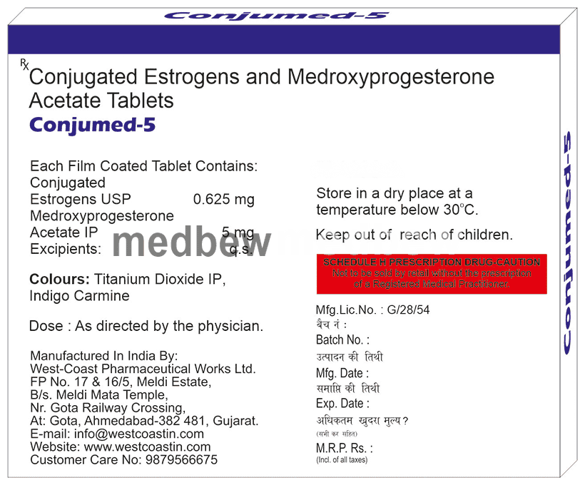 Conjumed 5 Tablet is a mixture of estrogens (female sex hormone). In women who are undergoing or have attained menopause, it prevents symptoms such as hot flushes, night sweats and mood swings. It also prevents the bones from becoming porous and fragile (osteoporosis).