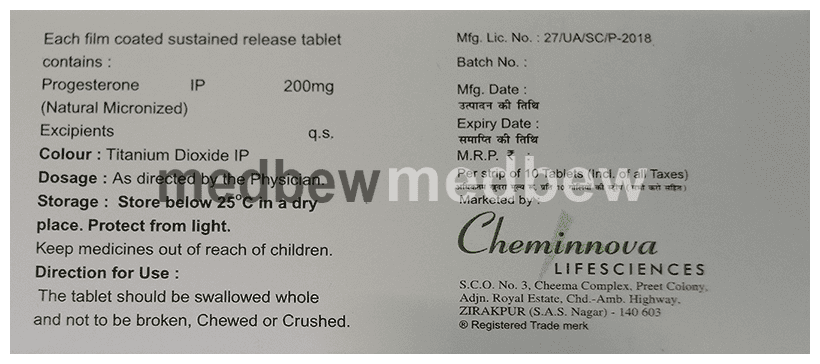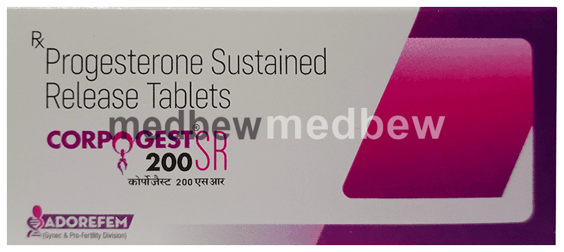Corpogest 200 SR Tablet contains progesterone, a female hormone that is important in the regulation of ovulation and menstruation. It is used to cause menstrual periods in women who have not reached menopause but are not having periods due to a lack of natural progesterone in the body. Progesterone helps to prepare the uterus for pregnancy by causing the uterus lining (endometrium) to thicken. This increases the chance of a successful pregnancy. You should use the medicine as prescribed for it to be effective. You may be asked to continue with this treatment for a period after becoming pregnant.show moreshow less