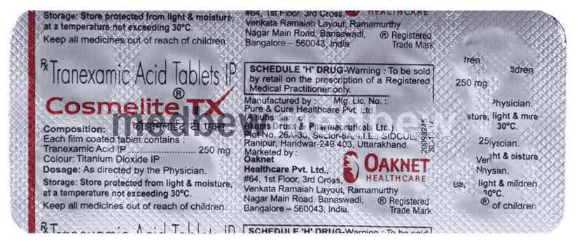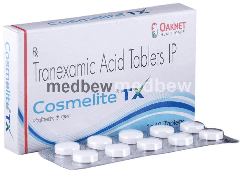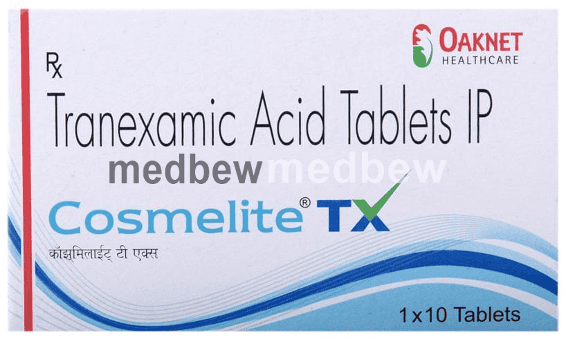 Cosmelite TX Tablet is an anti-fibrinolytic. It works by preventing the breakdown of clots which leads to the stoppage of bleeding. This medicine must be taken in the dose and duration as advised by the doctor. You should not take it if you have any known allergy to this medicine.