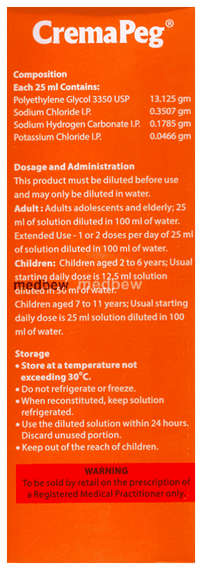 CremaPeg Oral Solution may be taken with or without food in a dose and duration as advised by the doctor. Excessive intake may cause electrolyte imbalance leading to unwanted side effects such as stomach cramps and flatulence. Keep taking this medicine for as long as your doctor recommends. If you stop treatment too early your symptoms may come back and your condition may worsen. Let your doctor know about all other medications you are taking as some may affect, or be affected by this medicine.It is important to consult a doctor before taking