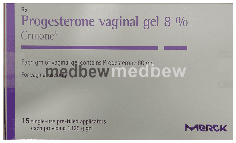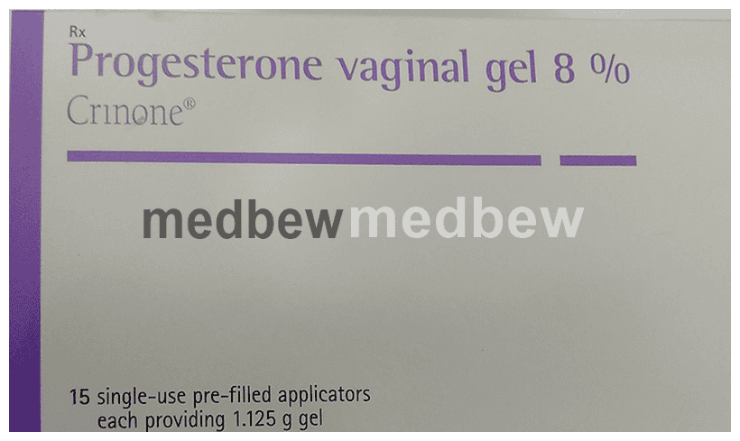 Crinone 8% Vaginal gel contains progesterone, a female hormone that is important in the regulation of ovulation and menstruation. It is used to cause menstrual periods in women who have not reached menopause but are not having periods due to a lack of natural progesterone in the body. This medicine helps to prepare the uterus for pregnancy by causing the uterus lining (endometrium) to thicken. This increases the chance of a successful pregnancy. You should use the medicine as prescribed for it to be effective. You may be asked to continue with this treatment for a period after becoming pregnant.show moreshow less