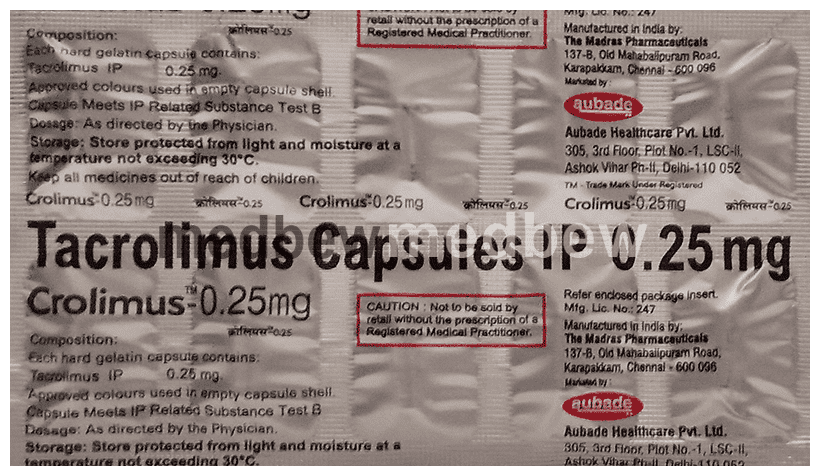 Crolimus 0.25mg Capsule lowers your immune system making you susceptible to catching more infections than usual.Before taking this medicine, tell your doctor if you have kidney, liver, or heart problems, diabetes, or high blood pressure. Also let your doctor know what other medications you are taking, especially for infections, pain, and arthritis. These and others may affect, or be affected by, this medicine. You should limit your exposure to the sun and UV (ultraviolet) light while taking it because immunosuppressants could increase your risk of skin cancer.Both men and women using this medicine should use effective birth control to prevent pregnancy. This medicine is not normally recommended during pregnancy or while breastfeeding unless it is clearly needed. Before and during treatment you will need frequent medical tests to monitor your progress, and your blood pressure will need to be checked often.