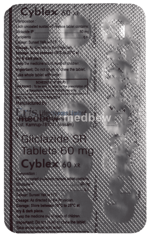 Cyblex 60 XR Tablet is a medicine used to treat type 2 diabetes mellitus in adults. It belongs to a group of medicines called sulfonylureas and helps control blood sugar levels in people with diabetes. This helps to prevent serious complications of diabetes like kidney damage and blindness.