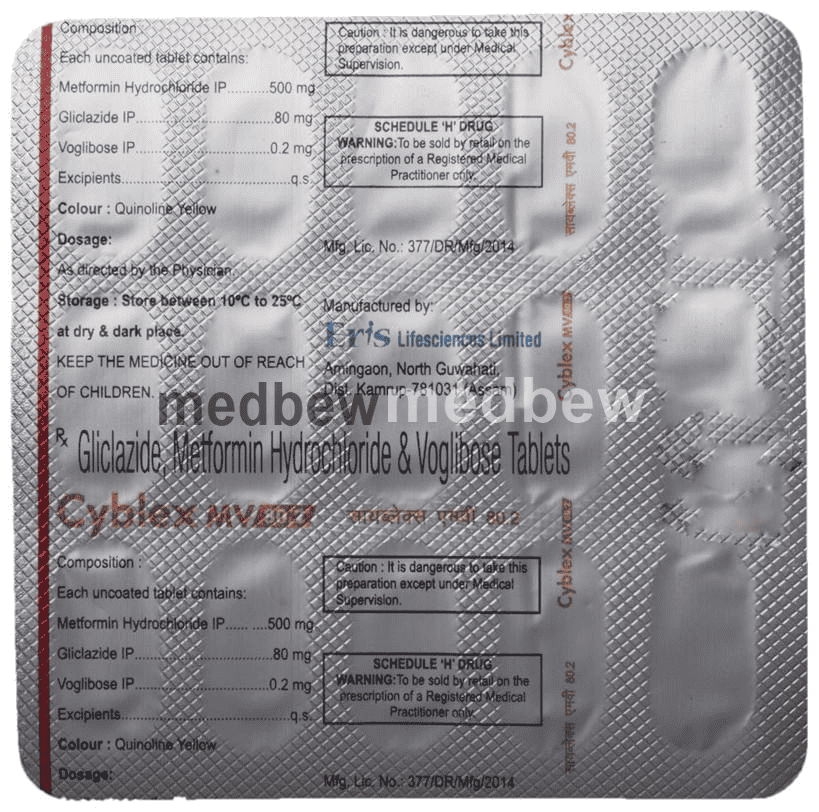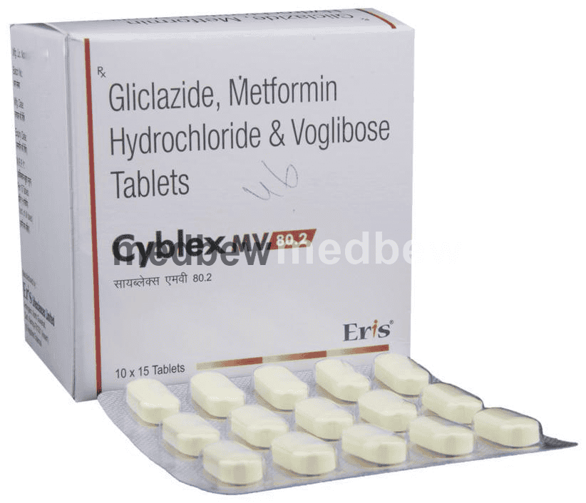 Cyblex MV 80.2 Tablet belongs to a category of medicines known as anti-diabetic drugs. It is a combination of medicines used to treat type 2 diabetes mellitus in adults. It helps control blood sugar levels in people with diabetes.