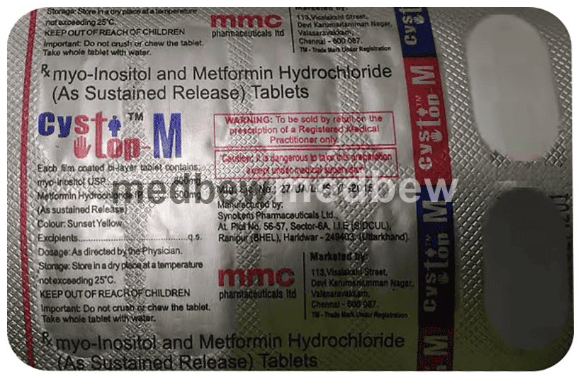 Cystop M Tablet SR is a combination of two medicines: Metformin and Myo Inositol. This medicine is used in the treatment of Polycystic ovarian syndrome (PCOS). Metformin is an antidiabetic medicine which helps to regulate menstrual cycle by improving the insulin sensitivity. This helps in regularizing the menstrual cycles in women. Myo-inositol is safe and effective and acts as natural insulin sensitizer which helps to reduce androgen (male) hormones and restores ovulatory function in females.