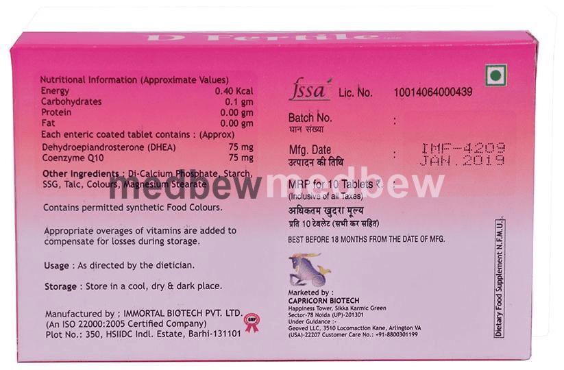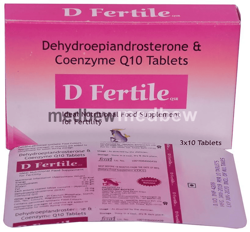 D Fertile QSR Tablet is a combination medicine used in the treatment of female infertility. It is converted into sex hormones in the body which are essential for the production and development of healthy eggs.