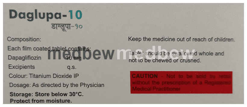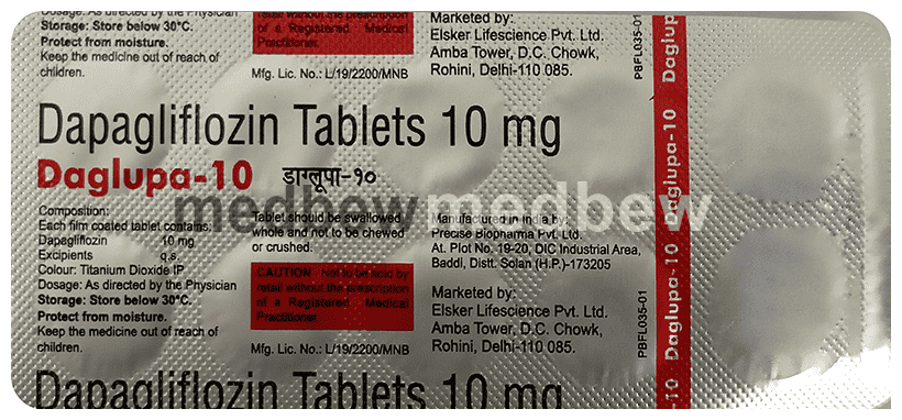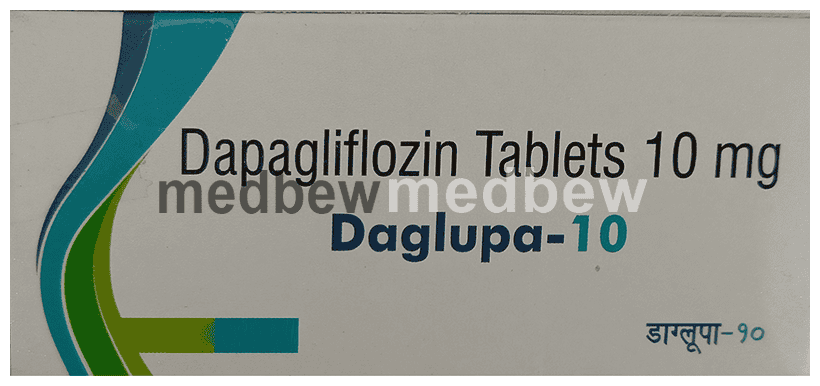 Daglupa 10 Tablet is used to lower blood glucose levels in type 2 diabetes. In type 2 diabetes, the body does not make enough insulin or is not able to use the produced insulin properly. This leads to an increase in the levels of sugar in your blood. Daglupa 10 Tablet works by removing excess sugar from your body via your urine. In addition to that, it can also help prevent heart disease.