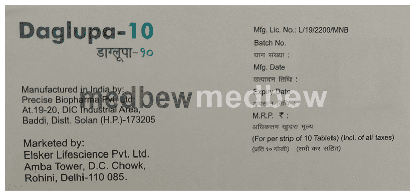 Daglupa 10 Tablet is an antidiabetic medication. It works by removing excess sugar from your body through urine.