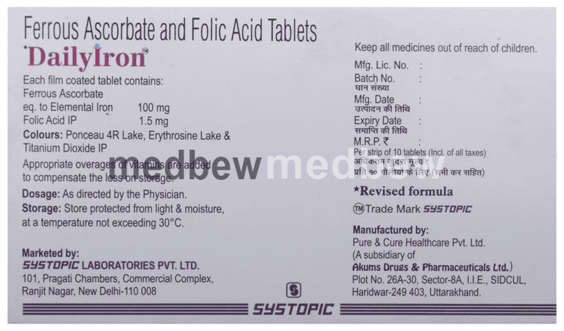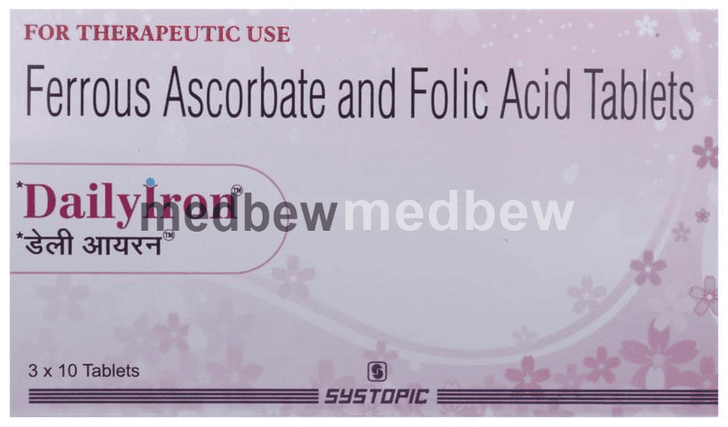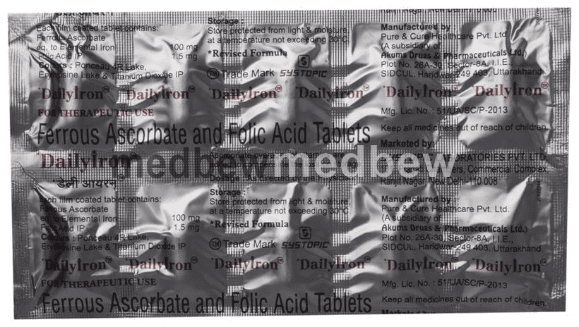 Daily Iron Tablet is a combination of two medicine used for treatment of iron deficiency and anemia. It helps the body make healthy new cells and maintain iron level in the blood.
