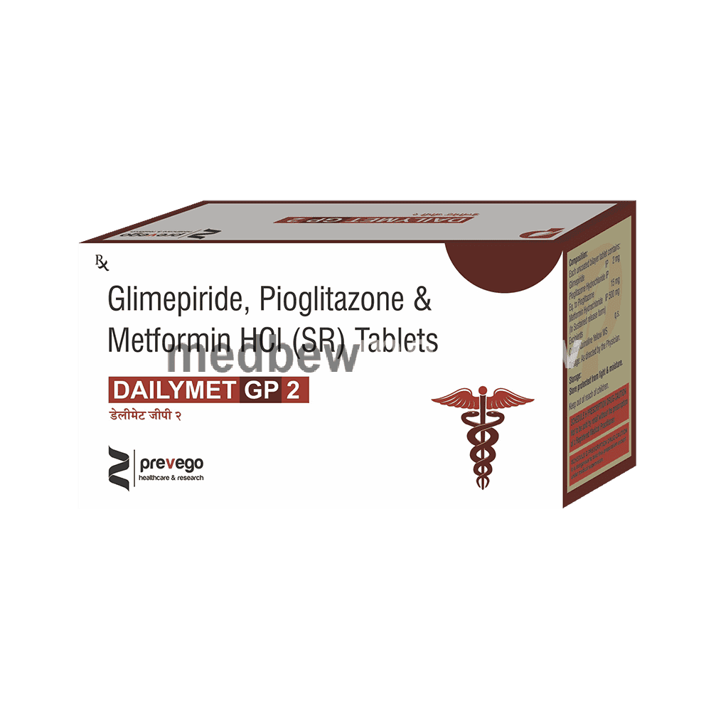 Dailymet GP 2 Tablet SR may be used alone or along with other medicines. It should be taken just before or with the first meal of the day. Take it regularly at the same time each day to get the maximum benefit. Your doctor will decide what dose is best for you and this may change from time to time according to your blood sugar levels.Keep taking this medicine, even if you feel well or your blood sugar levels are controlled. If you stop it without consulting your doctor, your blood sugar levels could rise to put you at risk of diabetes complications such as kidney damage, blindness, nerve problems, and loss of limbs. Remember that it is only part of a treatment program that should also include a healthy diet, regular exercise, and weight reduction as advised by your doctor. Your lifestyle plays a big part in controlling diabetes.The most common side effects of taking this medicine include low blood sugar levels (hypoglycemia), nausea, headache, and dizziness. Make sure you recognize the signs of having low blood sugar levels, such as sweating, dizziness, headache, and shaking, and know how to deal with them. To prevent this, it is important to have regular meals and always carry a fast-acting source of glucose such as sugary food or fruit juice with you. Drinking alcohol can also increase your risk of low blood sugar levels and hence should be avoided. Some people may experience an increase in weight with this medicine.You should not take it if you have type 1 diabetes mellitus, diabetic ketoacidosis (high levels of acid in your blood), or if you have severe kidney or liver disease. Before taking this medicine, tell your doctor if you have ever had heart disease, thyroid disease, or some hormonal conditions, as it may not be suitable. Pregnant or breastfeeding women should also consult their doctor before taking it. Your blood sugar levels should be checked regularly and your doctor may also advise blood tests to monitor your blood cell counts and liver function.