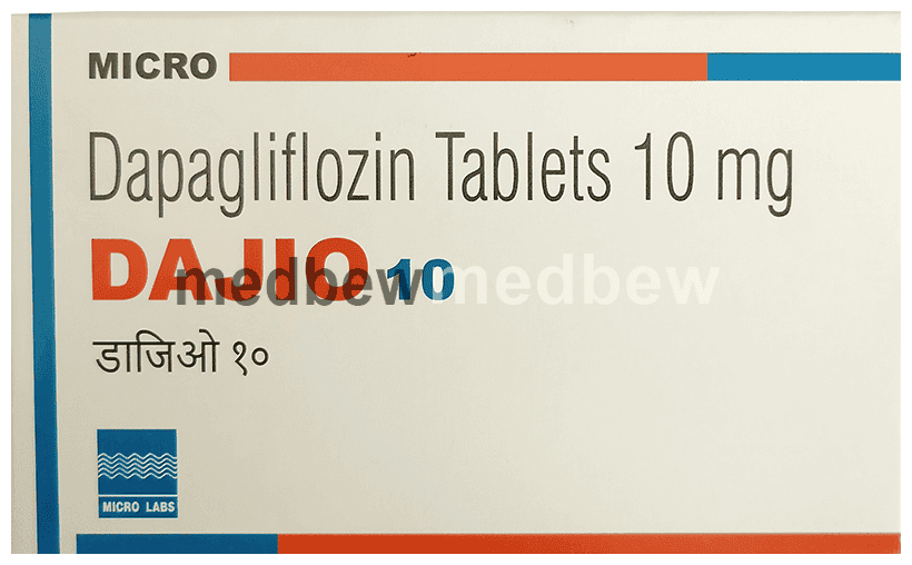 Dajio 10 Tablet is used to lower blood glucose levels in type 2 diabetes. In type 2 diabetes, the body does not make enough insulin or is not able to use the produced insulin properly. This leads to an increase in the levels of sugar in your blood. Dajio 10 Tablet works by removing excess sugar from your body via your urine. In addition to that, it can also help prevent heart disease.