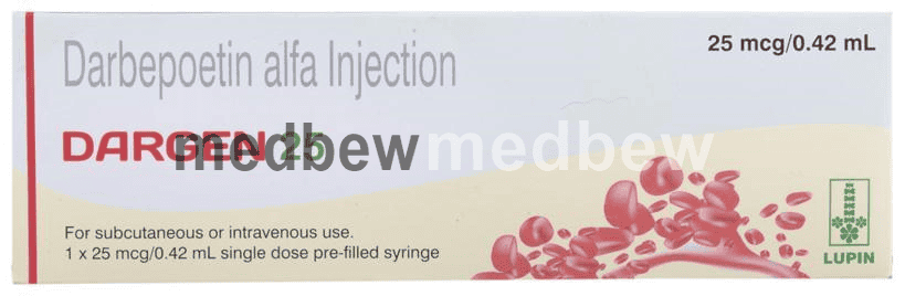 Dargen 25 Injection is used in the treatment of anemia that may have occurred due to chronic kidney disease or chemotherapy. It works by stimulating the bone marrow to produce more red blood cells.