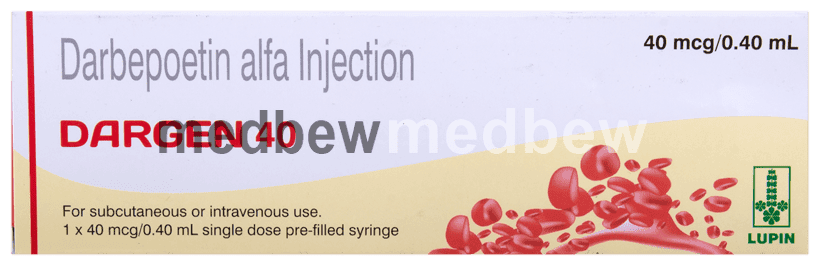 Dargen 40 Injection is used in the treatment of anemia that may have occurred due to chronic kidney disease or chemotherapy. It works by stimulating the bone marrow to produce more red blood cells.