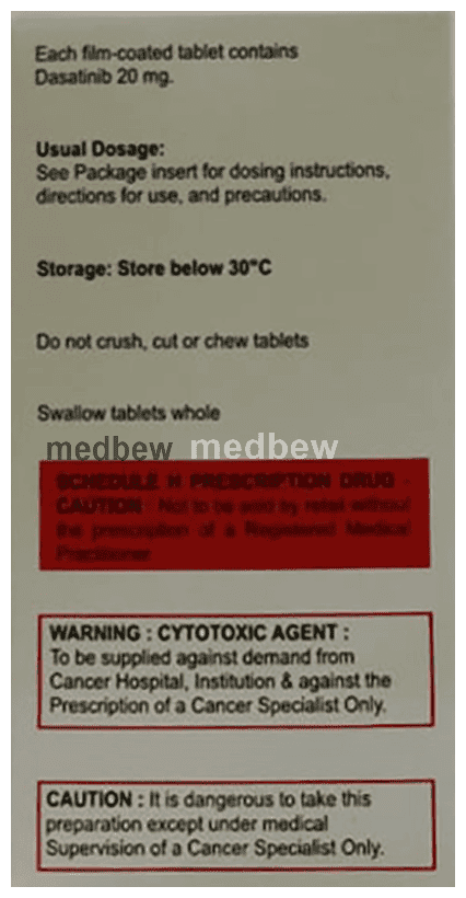 Dasashil 20mg Tablet is an anti-cancer medication. It works by blocking the action of the abnormal protein that signals cancer cells to multiply. This helps to stop or slow the spread of cancer cells.
