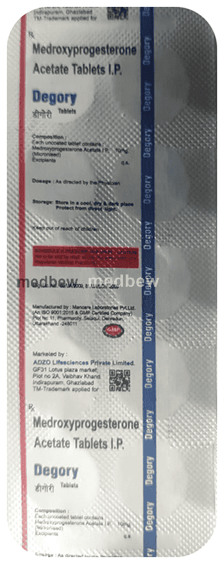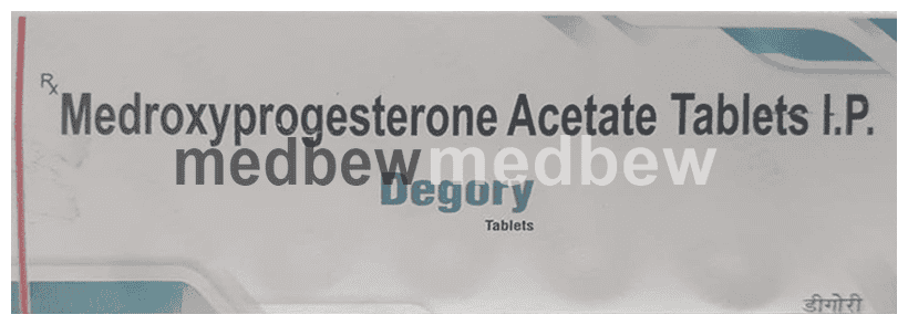 Degory Tablet works similar to the progesterone hormone naturally produced by the body. It helps in regulating the periods, stopping irregular bleeding and for controlling the withdrawal bleeding in case of amenorrhea (unusual stopping of menstrual periods). It is also used to prevent endometrial hyperplasia (thickening of the lining of the uterus) in women who are taking conjugated estrogens.