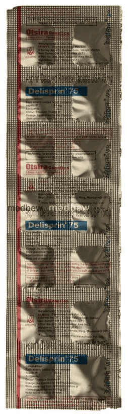 Delisprin 75 Tablet is a non-steroidal anti-inflammatory drug (NSAID) with anti-platelet action. It works by preventing platelets from sticking together which decreases the formation of harmful blood clots. This lowers the chance of heart attack or stroke.