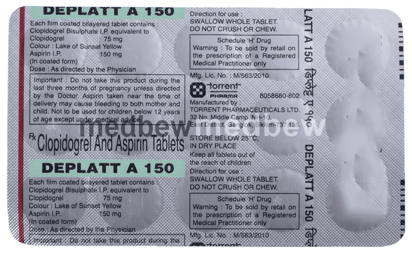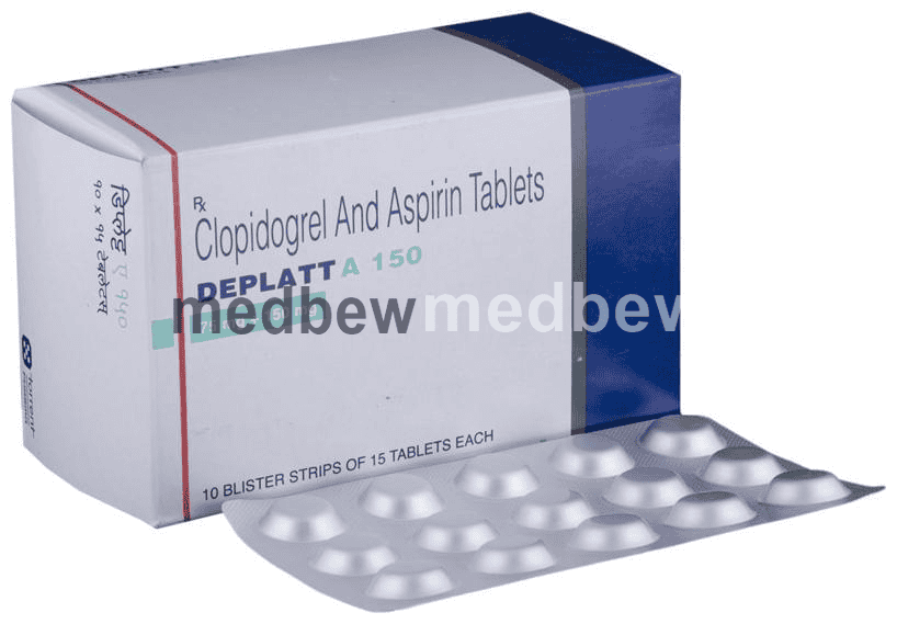 Deplatt A 150 Tablet is a combination of two antiplatelet medicines: Aspirin and Clopidogrel which prevent heart attack. They work by preventing the platelets from sticking together and decrease the formation of harmful blood clots.