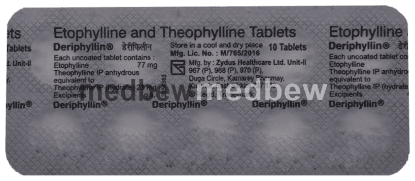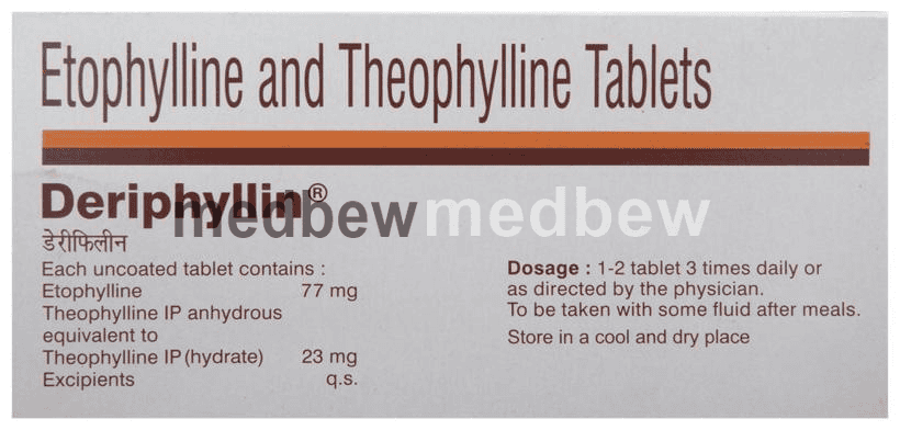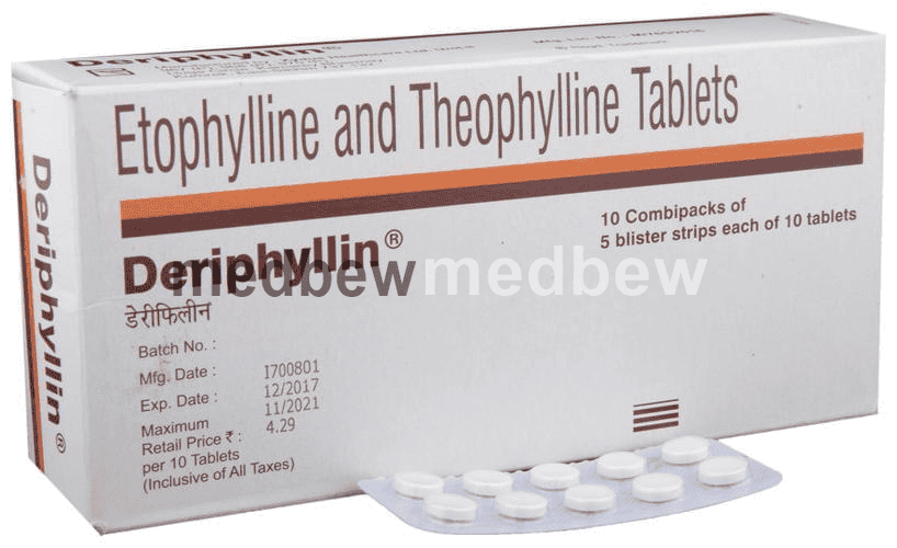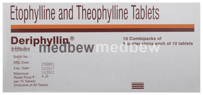 Deriphyllin Tablet is used to treat asthma and chronic obstructive pulmonary disorder (a lung disorder in which the flow of air to the lungs is blocked). It helps in relaxing the muscles of the air passages and making it easier to breathe.