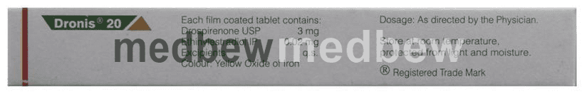 You may experience irregular vaginal bleeding while taking Dronis 20 Tablet. Other common side effects include headache, nausea (feeling sick), depression (sad mood), and breast pain. Most of them are temporary if these persist consult with your doctor.