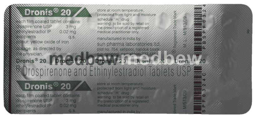Dronis 20 Tablet is a combined oral contraceptive pill. It works by preventing the release of egg (ovulation) and affecting sperm movement in the womb to prevent its union with the egg. It also changes the lining of the womb and renders it unsuitable for pregnancy.