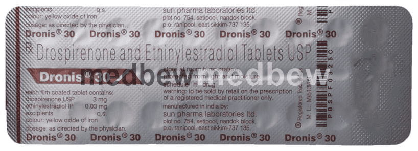 Dronis 30 Tablet is a combined oral contraceptive pill. It works by preventing the release of egg (ovulation) and affecting sperm movement in the womb to prevent its union with the egg. It also changes the lining of the womb and renders it unsuitable for pregnancy.