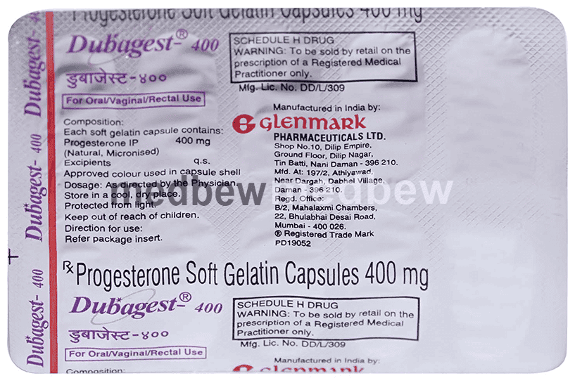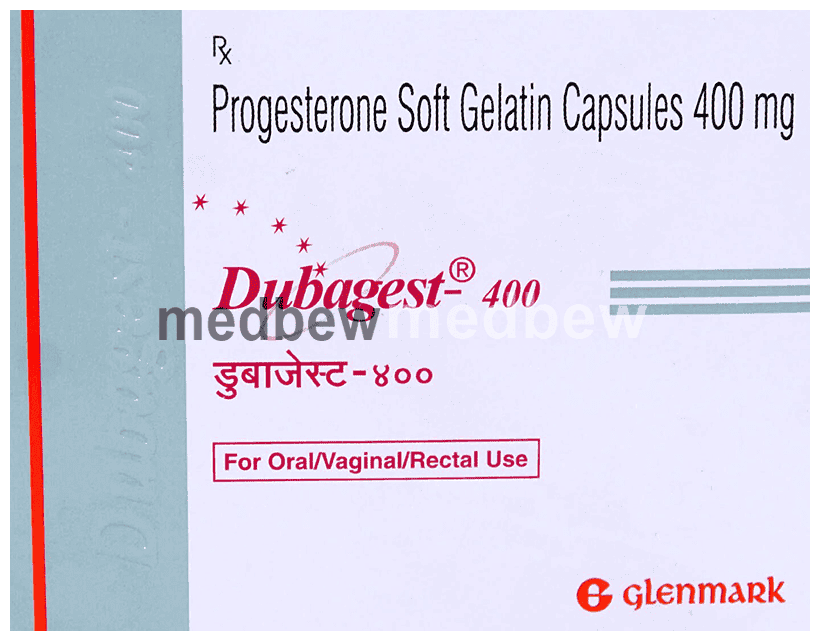 Dubagest 400 Soft Gelatin Capsule is a progesterone (female hormone). It works on the lining of the uterus and helps to establish and maintain pregnancy in infertile women. It helps in protecting the uterus from the negative effects of oestrogen when used for the treatment of postmenopausal symptoms.
