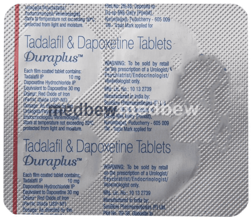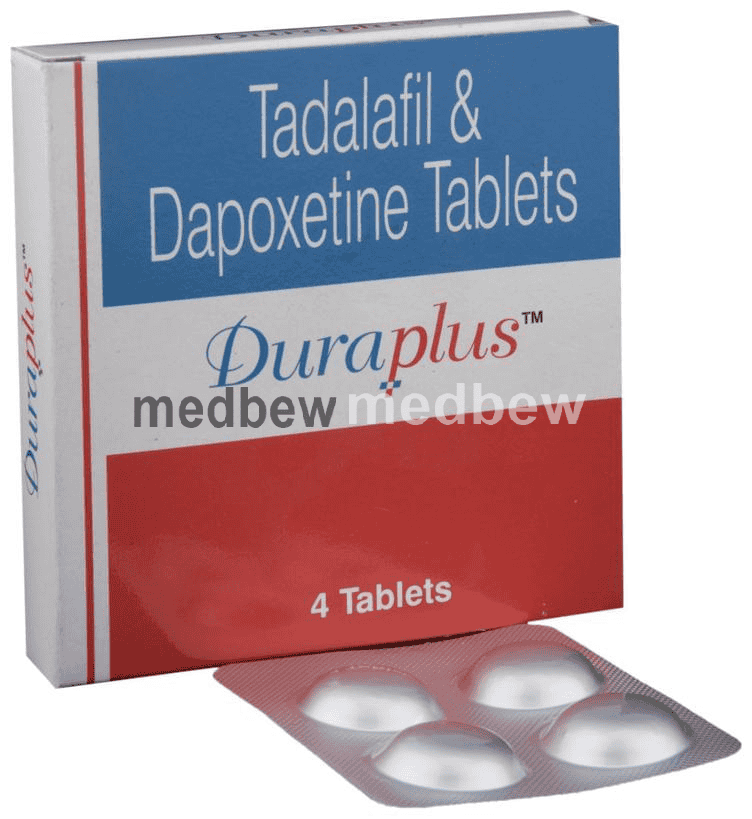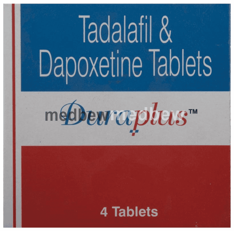 Duraplus Tablet is a combination of two medicines : Tadalafil and Dapoxetine, which treat premature ejaculation. Tadalafil is a phosphodiesterase type 5 (PDE 5) inhibitor which works by increasing blood flow to the penis during sexual stimulation and enables its erection following sexual stimulation. Dapoxetine is a selective serotonin reuptake inhibitor (SSRI) which increases the level of serotonin in nerves to improve control over ejaculation and increase the time taken to ejaculate.