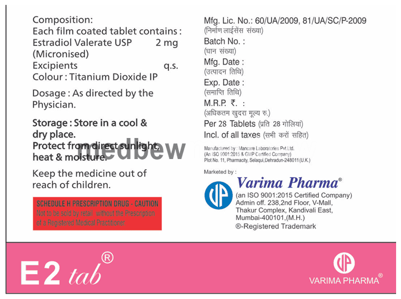 E2 Tablet is a female sex hormone (estrogen). This is a type of hormone replacement therapy (HRT) that is used to treat symptoms associated with menopause (hot flushes, vaginal dryness, and itching), estrogen deficiency, and thinning of bones (osteoporosis).In some cases,