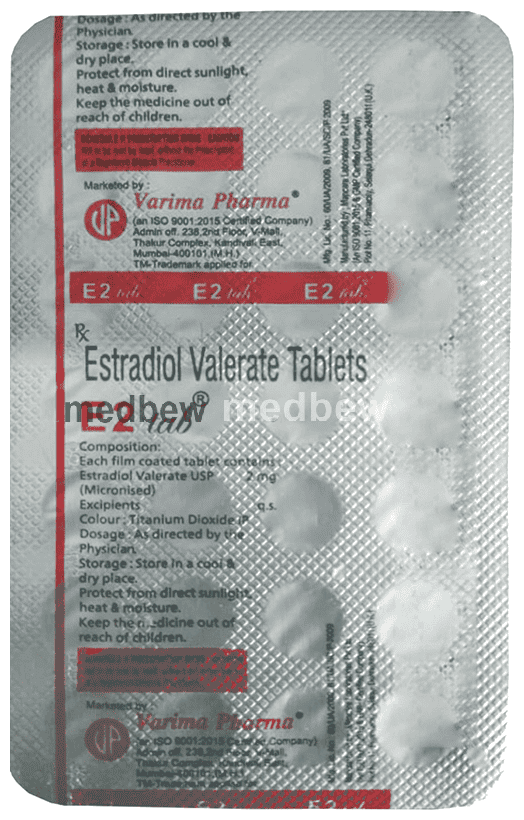 E2 Tablet contains a medication called estrogen (female sex hormone). It works by replacing estrogen that is normally produced by the body. In women who are undergoing or have attained menopause, it prevents symptoms such as hot flushes, vaginal burning, dryness, and itching, caused due to lack of estrogen.