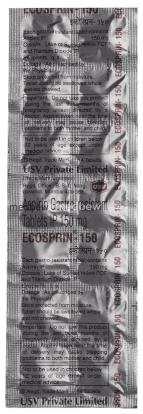 Ecosprin 150 Tablet is a non-steroidal anti-inflammatory drug (NSAID) with anti-platelet action. It works by preventing platelets from sticking together which decreases the formation of harmful blood clots. This lowers the chance of heart attack or stroke.