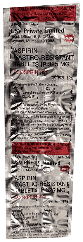 Ecosprin 325 Tablet prevents the formation of blood clots in blood vessels thereby reducing the risk of future heart attacks or strokes. In larger doses, Ecosprin 325 Tablet may be used in the treatment of a heart attack or a stroke that has been caused by a blood clot. It stops the blood clot that is blocking the supply of blood to the heart from growing any bigger.show moreshow less