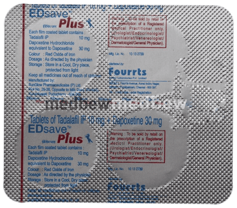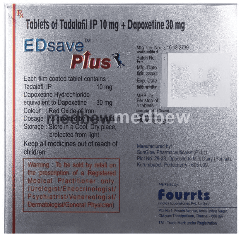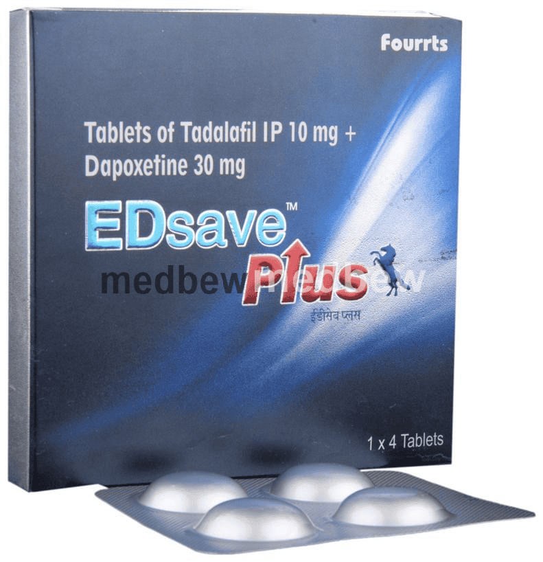 ED Save Plus Tablet is a combination of two medicines : Tadalafil and Dapoxetine, which treat premature ejaculation. Tadalafil is a phosphodiesterase type 5 (PDE 5) inhibitor which works by increasing blood flow to the penis during sexual stimulation and enables its erection following sexual stimulation. Dapoxetine is a selective serotonin reuptake inhibitor (SSRI) which increases the level of serotonin in nerves to improve control over ejaculation and increase the time taken to ejaculate.