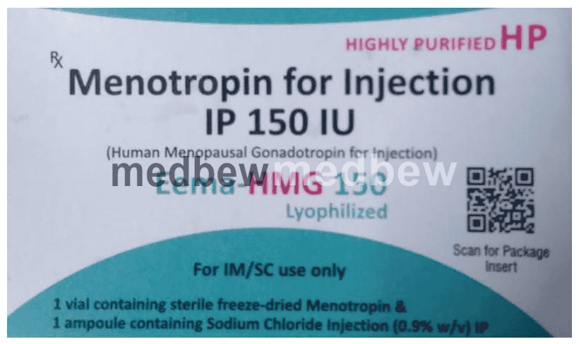 Eema Hmg 150IU Injection contains an active ingredient called Menotrophin. Menotrophin is a mixture of follicle stimulating hormone (FSH) and luteinizing hormone (LH). It is used to treat infertility in women, who face a problem with ovulation. It works by helping follicles (which contains egg) to mature in the ovaries, resulting in the release of a properly developed egg. It is also used in assisted reproductive technology procedures (ART) such as in-vitro fertilization (IVF), which help women to become pregnant. It may also be used in adult men, who have low sperm cell count, due to lack of certain hormones.