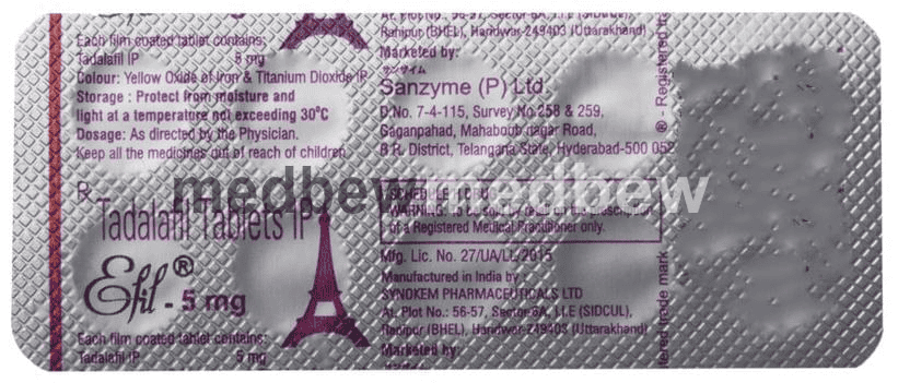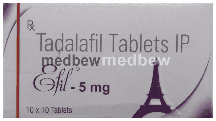 Efil 5mg Tablet is a phosphodiesterase (PDE-5) inhibitor. It works in erectile dysfunction by increasing blood flow to penis by relaxing the muscles in penile blood vessels.