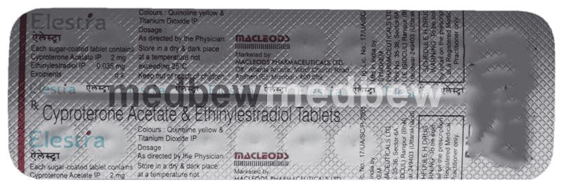 Women with Polycystic ovarian syndrome (PCOS) have high levels of male hormones called androgens, that are responsible for irregular menstrual cycles (periods), excessive hair growth and acne. Elestra Tablet is a combination medicine that helps in regulating the production of these androgens as well as periods in females. This also helps in treating excessive hair growth (hirsutism) and acne effectively. Take it as prescribed by the doctor. Do not skip any doses and follow your doctor’s instructions carefully to get maximum benefit.